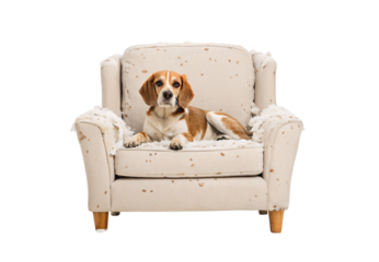 Beagle dog resting calmly on worn armchair with torn fabric, isolated on a transparent background