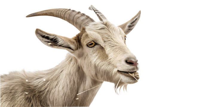 Ultra realistic goat portrait, medium close-up, goat calmly chewing hay, neutral relaxed expression, small pieces of dry hay falling gently around the goat, frozen mid-air, sharp focus, detailed fur t