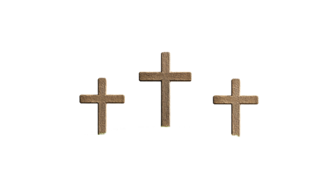 Three crosses silhouetted on a hill representing Calvary on transparent background