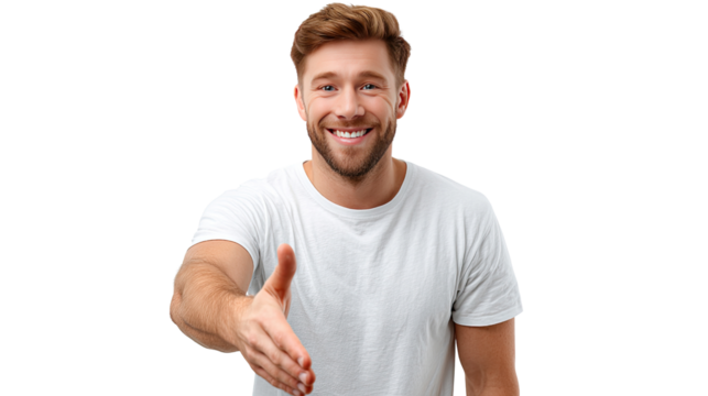 Friendly Handshake: A welcoming gesture of camaraderie is extended in a studio portrait, where a cheerful person with a warm smile offers a handshake, embodying trust and collaboration.