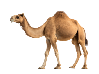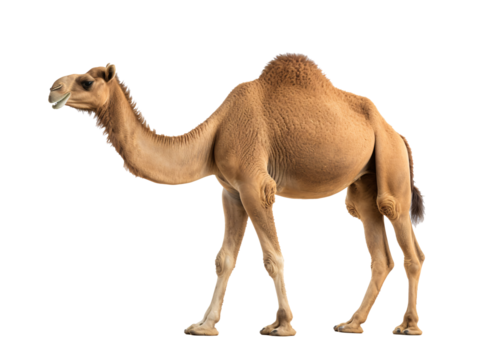 Profile of a standing camel isolated on white background, desert animal with distinct hump, perfect for wildlife and nature projects