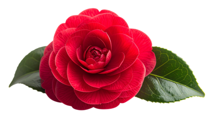 red camellia blossom, lush layered crimson petals, velvety texture, elegant composition, premium botanical photography style, soft diffused light, isolated on transparent background.