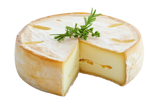 Fresh slice of creamy camembert cheese on a white background, closeup view of a delicious dairy product perfect for a snack or breakfast