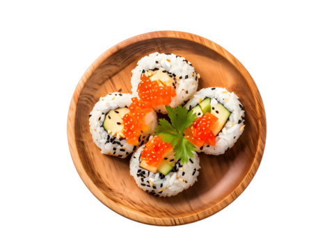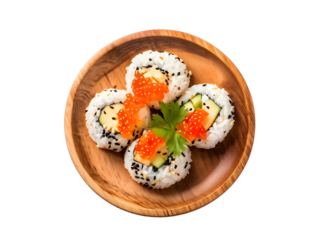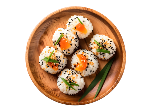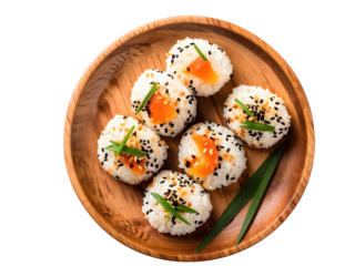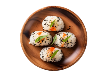 onigiri in wooden plate. Isolated transparent background. Top view, flat lay