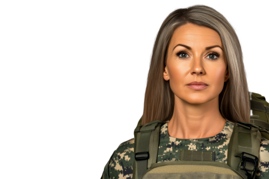 Mature woman with camouflage uniform, ready for duty, cut out transparent