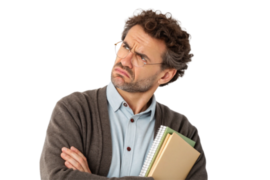 Stress, tired and man with glasses and headache on isolated, PNG and transparent background. Vision, prescription frame and male person rub eyes with hands for migraine, eyesight fatigue or anxiety