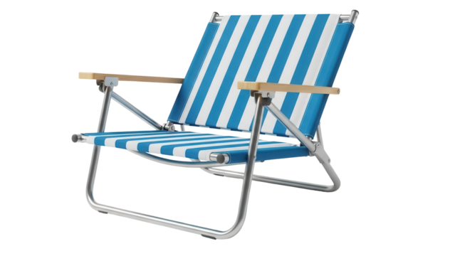 Isolated beach chair with blue and white stripes for sunbathing, relaxation or camping trip