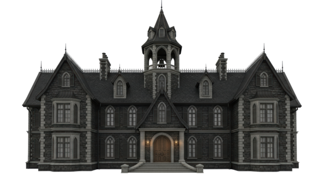 Isolated Victorian Gothic house, ornate architecture, dark and imposing facade, haunted home