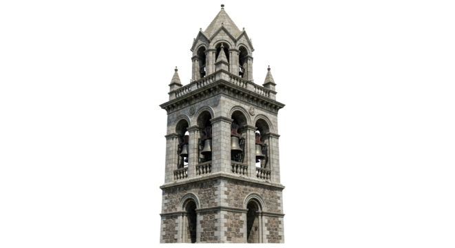 Majestic campanile on a pristine background, showcases intricate stonework and historical architecture, embodying timeless elegance and spiritual