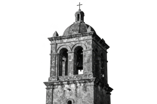 Historic stone tower with bells and cross isolated