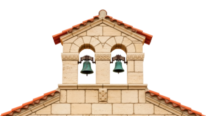 Isolated bell tower with two copper bells, terracotta roof tiles atop a stone building