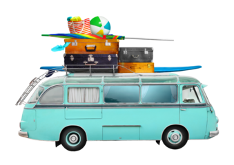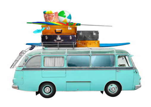 Retro camper van with luggage and beach equipment on the roof