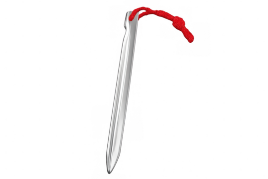 Metal tent stake securing red cord, lying on transparent surface, supporting campground equipment preparedness