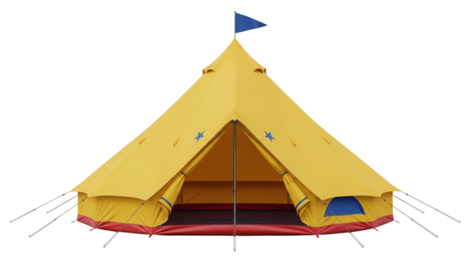 Isolated Yellow Tent for Outdoor Camping or Festival, Blue Flag on Top, Open Front, Staked Out