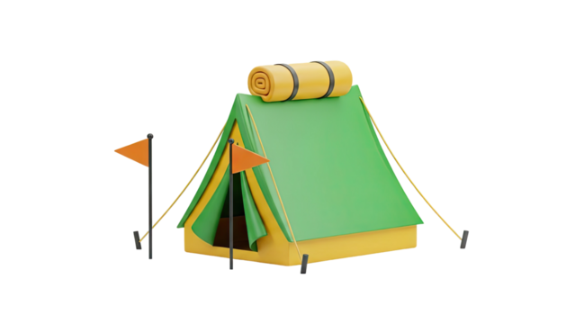 3D Cartoon 3D Camping Tent with Flags and Sleeping Roll on transparent background