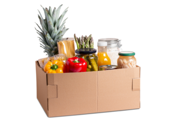 Isolated box with food for donation, charity concept. Canned food, pasta, fruits and vegetables in a box for donation isolated.