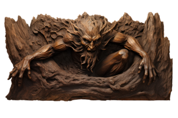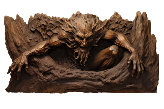 Close-up photo of wood carving, isolated on white background.