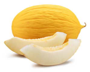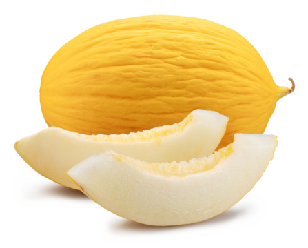 Canary yellow melon and melon slices isolated on white background. Cut out PNG file.