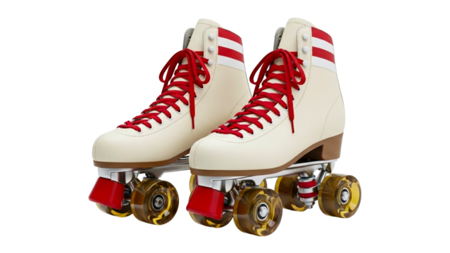 Classic cream colored roller skates with vibrant red laces and prominent red stripe accents designed for showcasing recreational sports and active lifestyle campaigns