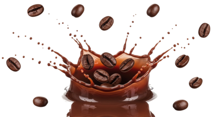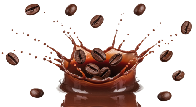Dynamic coffee splash with roasted beans for captivating marketing campaigns on transparent background