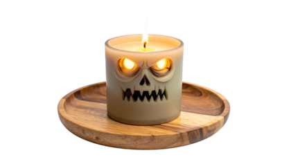 Scared Cartoon Candle with Glowing Eyes on Wooden Plate isolated on solid white background2
