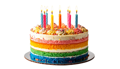 Colorful layered birthday cake with candles transparent background