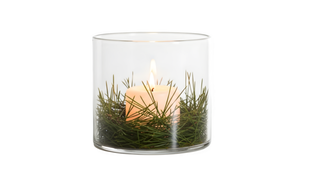 Burning candle in glass holder with fir branches  isolated on transparent background