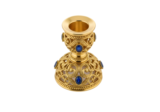 Ornate gold candleholder with intricate filigree design and blue gemstones displays elegant craftsmanship.