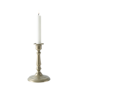 Lit cream candle on antique brass pedestal candleholder stand, isolated on a transparent background