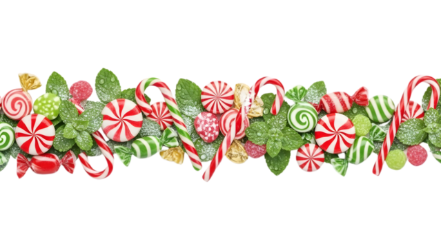 Christmas candy cane border with peppermint lollipops spearmint leaves and sweet treats isolated on transparent background