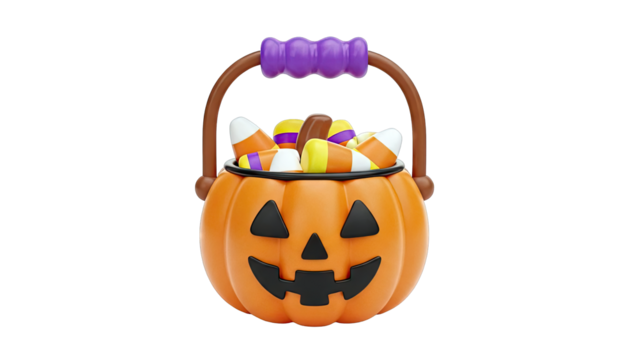 3D illustration of pumpkin bucket overflowing with candy isolated on transparent background