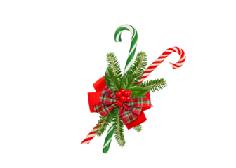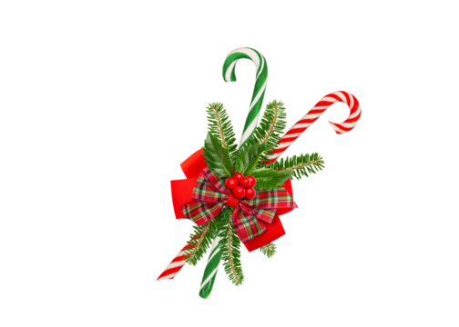 Christmas Greeting Card with Red Ribbon, Fir branches, Holly  Berries and Candy Cane on transparent Background.