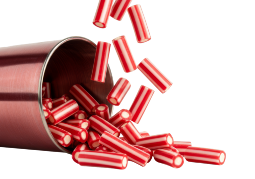 Red and white striped candies spilling from a metallic pink container on a black background scene shot