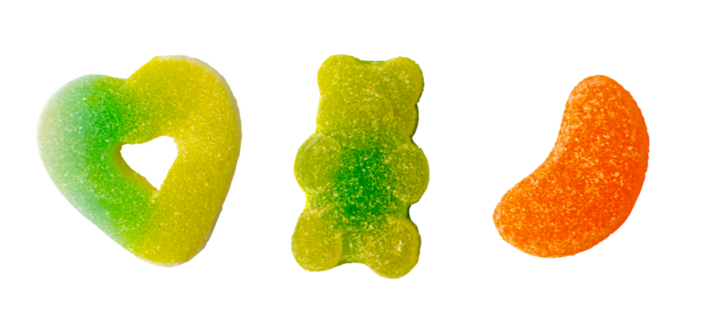 Colorful gummy candy set in bear, heart, and orange slice shapes with sugar and sour coating isolated on transparent for halloween trick or treat concept.