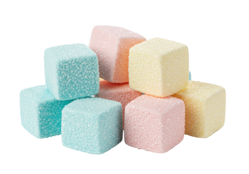Isolated cube shaped marshmallows pile with glitter, soft colored confectionery squares treat