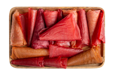 Colorful fruit leather rolls on wooden tray isolated on white background. Mats of crushed fruit ( tklapi ), fruit candy - pastille. Healthy vegan snack. Top view.