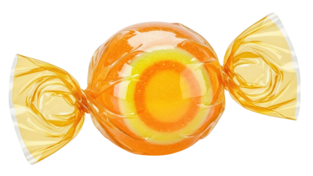 Orange and yellow candy in wrapper isolated PNG, hard candy sweet treat on transparent background for confectionery and holiday designs