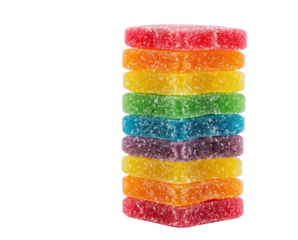A colorful stack of gummy candies arranged in a neat tower, showcasing vibrant hues and a sugary texture.