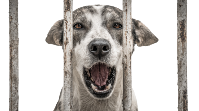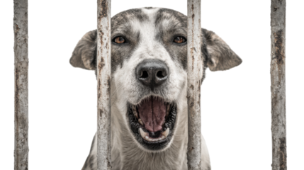 Imprisoned Canine's Plea: A distressed dog, framed by weathered bars, emits a heartfelt bark, its eyes filled with a mix of desperation and hope. Capture the emotional resonance