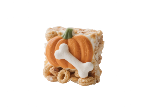 Halloween Dog Treat: Cereal Bar with Pumpkin and Bone Decor on White