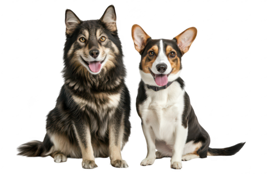Two happy dogs. a fluffy black canine and a sleek brown-and-white dog. sit side by side against a white background. their playful expressions and friendly demeanor