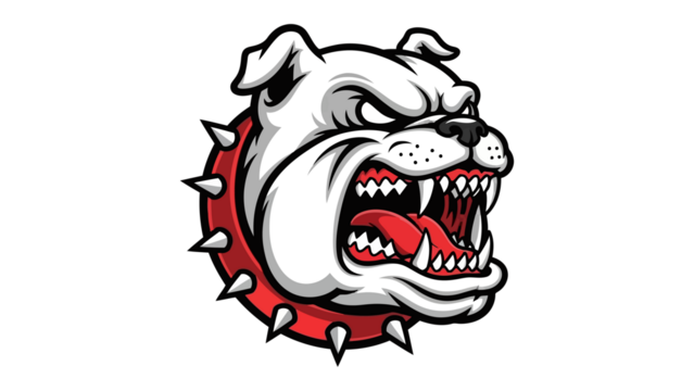 Fierce bulldog mascot head roaring with sharp teeth and spiked collar