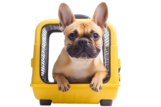 Adorable dog in pet carrier isolated on white