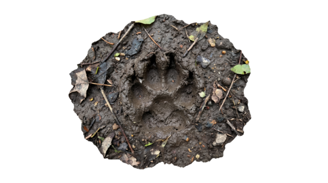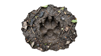 Isolated paw print in mud shows muddy animal track in nature trail with details visible