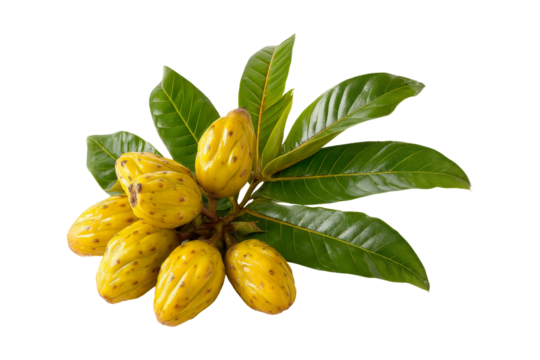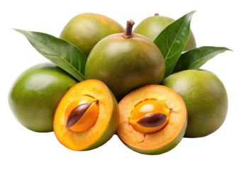 Yellow Sapote, Cluster of ripe sapotes with leaves, Sweet Tropical Fruit on a transparent background.