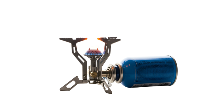 Lit camping stove burner with blue gas canister on dark background