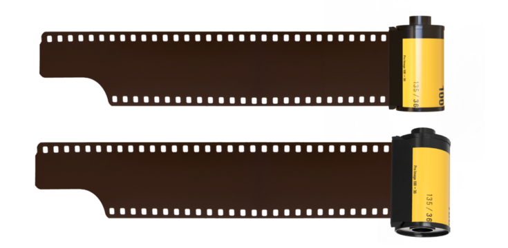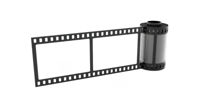 A roll of black and white photographic film with two blank frames unspooling from the canister against a white background.