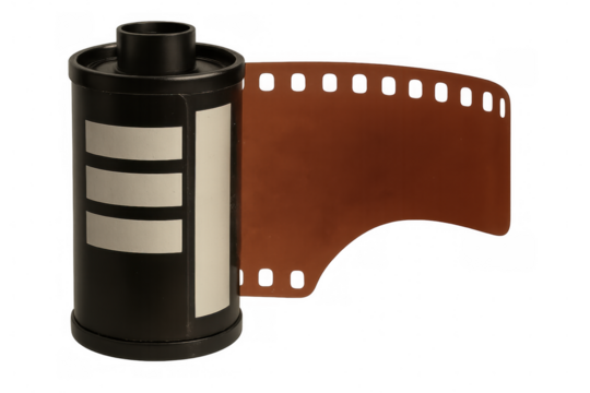 Vintage photographic film canister partially unrolling, revealing textured celluloid surface against clean white backdrop
