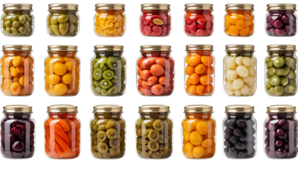 Colorful jars filled with preserved fruits and vegetables png