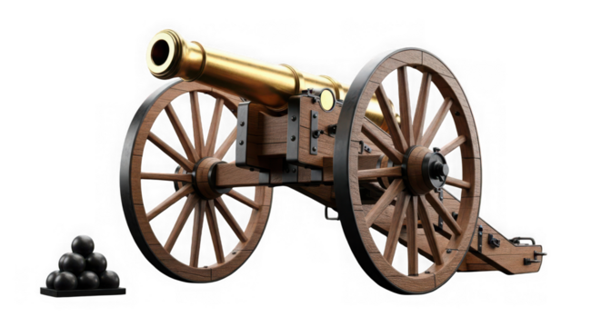 Antique brass cannon with cannonballs isolated on transparent background